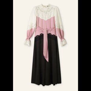 Feminine lace trims break up the clashing palette of this luxuriously soft pure silk dress to highlight the modern color-block design. It’s crafted with a high frilled neckline and cap sleeves which provide flattering coverage of the arms.