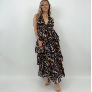 MEET ME IN SANTORINI FLORAL HALTER TIERED RUFFLE FOREST FAIRY MAXI DRESS SIZE XS