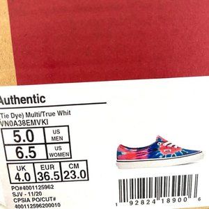 The Tie Dye Authentic combines the original and now iconic Vans low top style with sturdy textile uppers, an allover tie-dye print, metal eyelets, and signature rubber waffle outsoles.