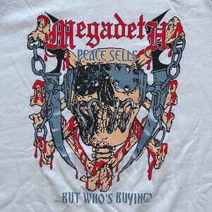 Here is a baseball jersey celebrating Megadeth's 2nd disc "Peace Sells...But Who's Buying?" Vic Rattlehead graphic front. The size is Large measuring 21.5"w X 30"h. Gently worn and in excellent condition.