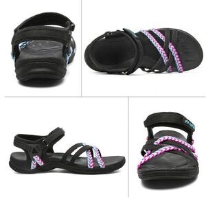 STYLISH & COMFORT== Women hiking Sandals designed with Rebound Footbed and Rubber Outsole for greater shock absorption. Adjustable sandals with quick drying Hook and Loop Straps, EVA midsole and Rugged all around foot protection design, effectively holds feet in place and prevents abrasions. Description