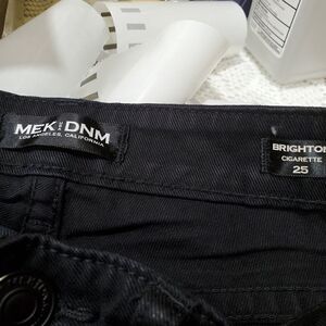 Mek dnm Brighton cigarette raw hem skinny jeans size 25 length is 31in waist 13.5in inseam 25.5in rise 6in leg opening 6in measurements are approximate not exact and is not doubled and are measured with the item laying flat binN