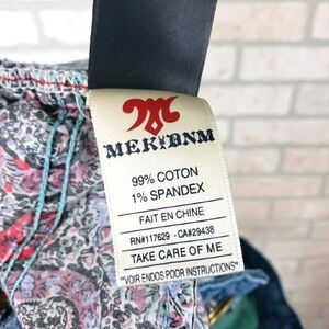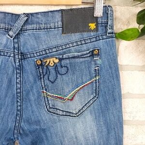 MEK DNM Paros Style Capris Low Rise Size 27. The capris have 3 front pockets, belt loops and a button and zipper closure, there are also 2 back pockets as well. They have colorful stitching on the front and back pockets with a great faded look. Excellent condition, no holes or rips.
