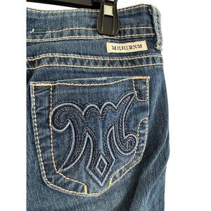 MEK Denim Orleans Boot Cut Jeans Size 31x34 Distressed Blue Embroidery Blend Mad