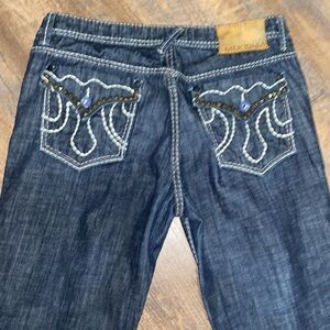MEK USA WILSHIRE STRAIGHT LOW RISE FLARE LEG DARK WASH TOP STITCHING EMBELLISHED