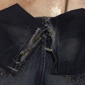 Back tag is a little loose partially unsown frayed & damaged leg cut leg frayed damaged cuffs *