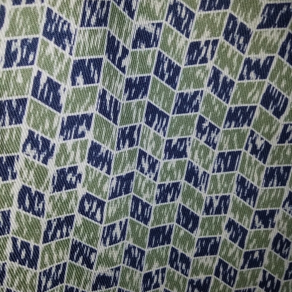 MelindaGloss colorful boyfriend jean. off-white base with green, teal and blue design all over. They are made in Portugal but is a French Label known for straightforward masculine style with Parisian twist. 100% cotton, flat waist 15", 10 1/2" rise, 31" inseam, 6 1 /2" leg opening. buttons are black metal and super great quality.