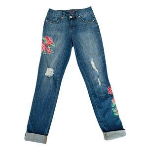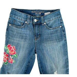 Jeans have the Slimming Silhouette System. They have floral embroidery and distressing.