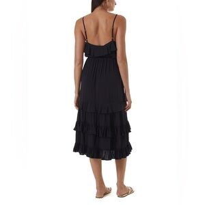 The Bethan Midi Dress has brand name engraved gold buttons and graceful frill tier detailing to add charm to this modern little black dress. Utilize the drawstring waist to create shape to your silhouette when wearing this over-the-shoulder piece.