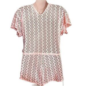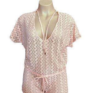 MELISSA ODABASH ~ Women's sheer lace beach cover-up / romper in pastel peach. Size Small. Deep V-neck with tie accent and drawstring waist. Short sleeves. Beautiful crochet-like lace. Made in Italy.