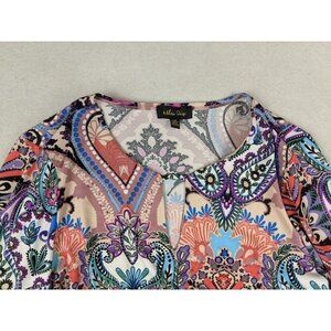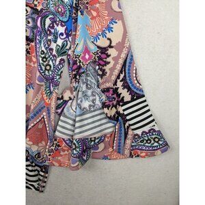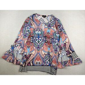 MELISSA PAIGE - WOMEN'S PRINT 3/4 RUFFLE BELL SLEEVE STRETCH KNIT TOP - SIZE L