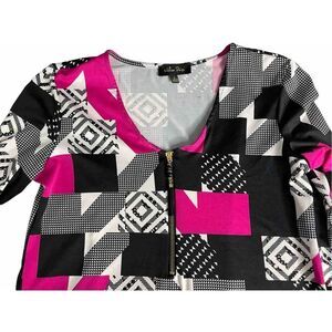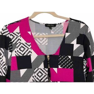 Features: Deep V-neck with zipper and tassel detail, flowy loose fit, trendy bright abstract Geo print