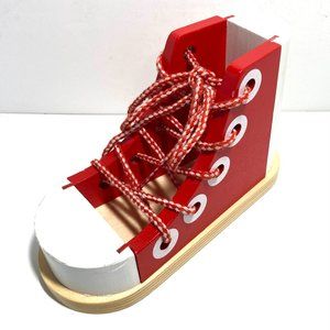 I can do it myself! Few things will give your child more satisfaction than mastering shoe-lacing and -tying skills. This wooden high-top sneaker will make practicing enjoyable and help your child reach the developmental milestone of learning to tie shoes.