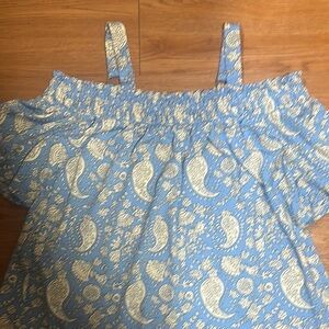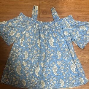 Chic off-shoulder top with paisley design. Features short sleeves and adjustable shoulder straps. Very feminine and sexy. Pair with simple black or white pants.