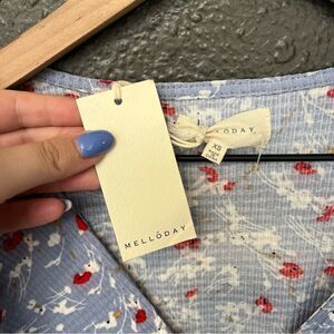 MELLODAY Ruffle Sleeve Faux Wrap Top NEW with tags Size XS SOFT BLUE FLRL Elastic at hem and sleeves V neck Puff sleeves Polyester/spandex