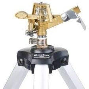 Pulsating impulse sprinkler with tripod. Features a durable metal head and extends to 48 In. height. Collapses for easy storage. Ideal for tall plantings.