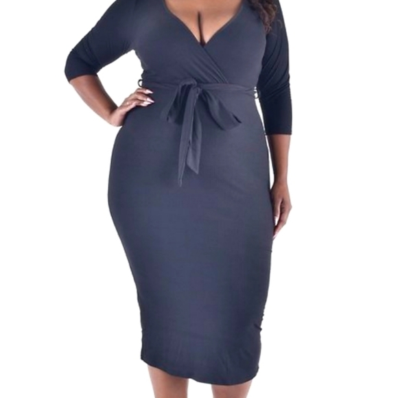 Black Stretch Fit V-neck Dress with attached black belt! Available in Plus Size Only!👄