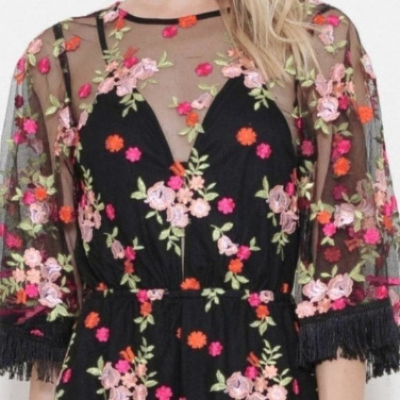 A partially lined, sheer mesh romper covered in floral embroidery, features a round neckline, a back keyhole cutout with a button-loop closure, playful fringe trim, on trend short sheer kimono sleeves as seen in listing, comfotable elasticized waist, and an attached V-neckline cami underneath.
