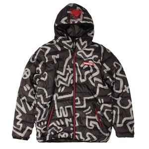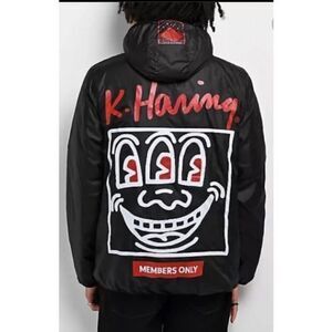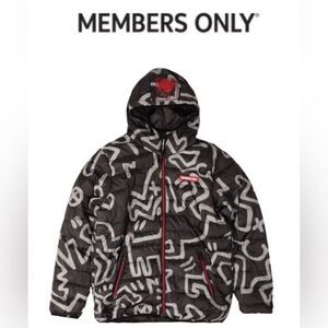 Members Only collaboration with Keith Harang Reversible Puffer Jacket in men's size XL. Red, gray and white graphics over a black background on both sides. It has a full zippered closure, reversible hood and dual hand pockets (on both sides) with red zippers. Elasticized sleeves and hem. Members Only red logo on both sides and in bold letters on the back. This is a warm and well-made jacket that's young, edgy and has an artsy look. It's 100% polyester. The pit-to-pit measurement is 26", the length is 29" and the sleeves are 26". Awesome jacket, versatile and NWT! GREAT GIFT.
