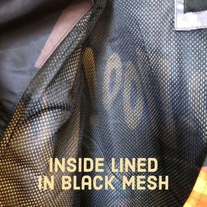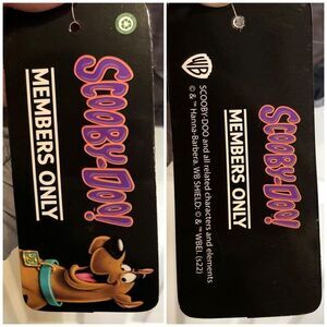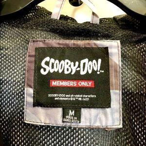 Members Only makes this Warner Bros. Licensed Scooby Doo and Shaggy Full-Zip Hooded Windbreaker in men's size MEDIUM. Colorful graphic front with Scooby Doo and Shaggy. Members Only logo patch on right pocket. Hand pockets on both sides. The back has Scooby Doo logo, a graphic of The Mystery Machine, and Members Only in Japanese letters. Elasticized cuffs and hem. It's 100% polyester, so machine wash (in cold) and tumble dry (on low). The windbreaker is completely mesh-lined. The hood has a red Members Only logo patch, and it is also mesh-lined. The pit-to-pit measurement is 24", the length is 28" and the sleeves are 25". This is so adorable and well-made. And it's NWT!