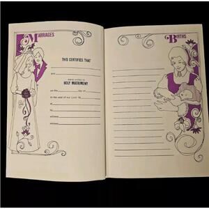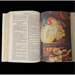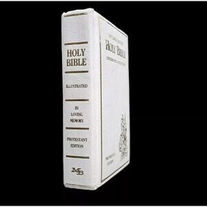 This vintage hardcover book is a memorial edition of the Holy Bible, illustrated with beautiful imagery that brings the text to life. It is a protestant edition King James Version. It has a name written in the front page. All personalize pages are still blank. Bible is sold as is seen in pictures. Please message with any questions before purchasing. Thanks for looking.