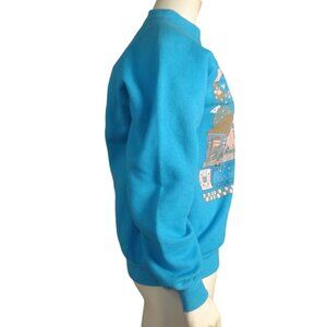 Aqua blue sweatshirt with a graphic print on the front. Also has hearts, teddy bears, flowers, Homes with trees behind them, kids toys and quilt patterns near the bottom. Very vintage granny style.