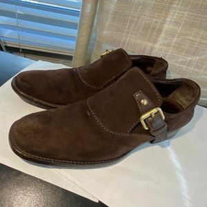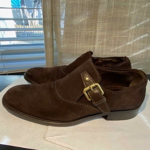 MEN'S LOUIS VUITTON BROWN SUEDE LEATHER CLOSED SHOES, ANKLE BOOTS WITH BRASS METAL BUCKLE ON SIDE & METAL BRASS ACCENT WITH LOUIS VUITTON ENGRAVED.