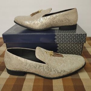 MEN'S AMALI EMBOSSED PAISLEY PRINT SLIP ON LOAFER WITH GOLD TASSELS. SIZE 10D