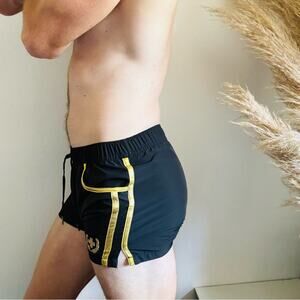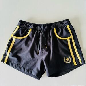 MENS ANDREW CHRISTIAN Gold Black Metallic Striped Print Swim Trunks Shorts M