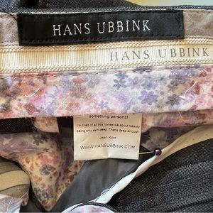 From Dutch designer Hans Ubbink, men’s dress slacks, pants. Beautiful gray cuffed slacks featuring flat front, zipper fly, belt loops, slant front pockets, back pockets (still stitched closed) straight cuffed leg. Made of cotton, viscose & nylon. (Go by my measurements, these are Euro size 54). Waist: 32” Inseam: 32”, Rise 11”.