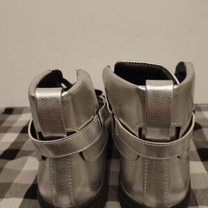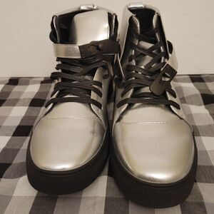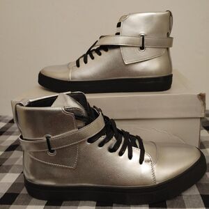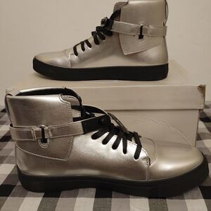 MEN'S DESIGNER LACE UP SNEAKER. METALLIC PEBBLE GRAIN UPPER WITH A SLIDE BUCKLE