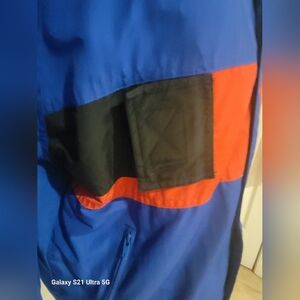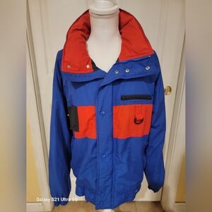 The jacket has a front zipper with a snap overlay. The jacket is machine wash and tumble dry. It is clean and ready to wear.