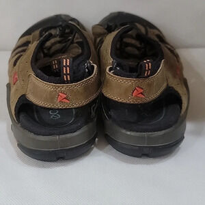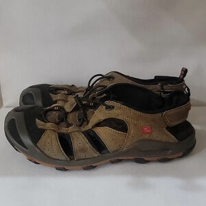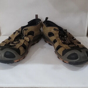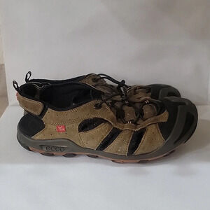 Men's Ecco brown leather sandals ( sz US 12 or Euro 44). There is a hook and loop closure at the ankle. You can also tighten the sandals at the top of the foot. The sandals are in great condition. Please see all pictures.
