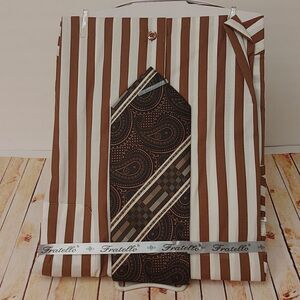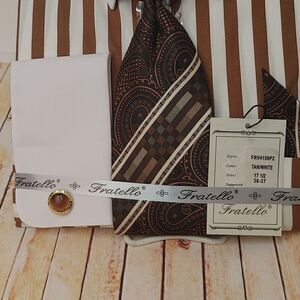 Tan and white bold stripe with brown and tan abstract tie and pocket square.