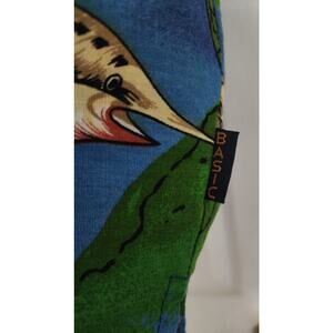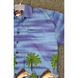 Men's XXL tropical blue shirt with dancing Dolphins and palm trees along the bottom. It is a shirt that has slits on the bottom sides to wear the shirt out. It is 100% cotton and is a square fit. It measures 28" from neckline to the bottom. It measures 26" along the shoulders. There is a small defect in the material just below the left pocket (see 2nd picture).