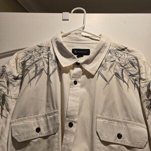 This mens dress shirt is white with light gray embroidery designs. It is comfortable and a soft material. It can be worn with jeans casually or dress up with slacks/dress pants or under a suit. It's in very good condition. It will sure add flair to your everyday attire! The shirt is a size 3XL. Now don't be shy, make me an offer please I cant say yes or make a sale if you don't send an offer! Thank you in advance!