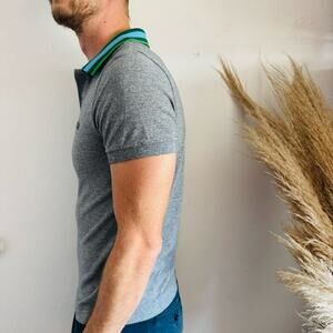 MENS LACOST Grey Gray Light Blue Green Striped Button Polo Short Sleeve Shirt S