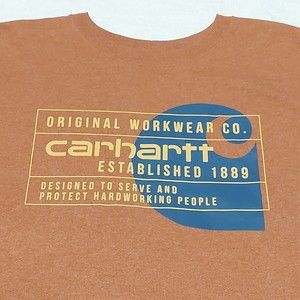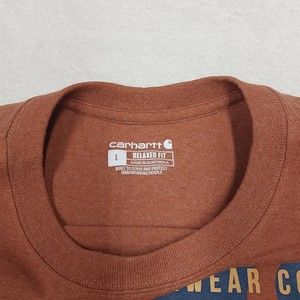 MEN'S LARGE RELAXED FIT SS CARHARTT GRAPHIC T-SHIRT (104610 R38) BURNT ORANGE. Some staining on front pictured above. Please see pictures for condition and measurements for proper sizing.