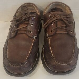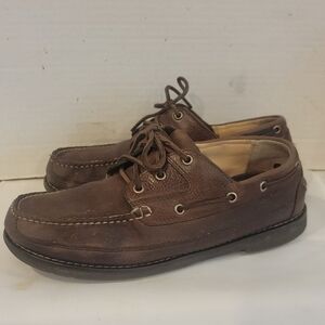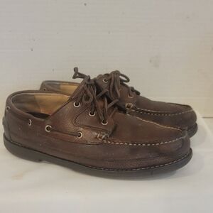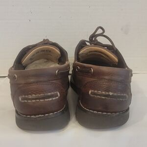 Men's L.L. Bean brown leather boat shoes ( sz 9-1/2 EE). The boat shoes have a little wear on the heel area. The shoes have been wipe with saddle soap. Please see all pictures