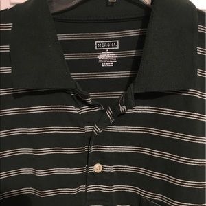 This MERONA men's short sleeve polo shirt features green & white stripes, collar, three front buttons & double stitched hem. It is made of 60% cotton & 40% polyester.