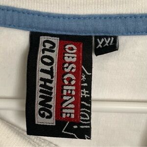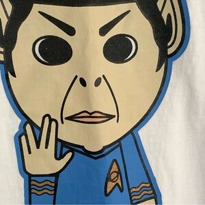 This is a men's T-shirt in 2XL size from Obscene Clothing featuring Spock from Star Trek. The shirt is white in color with short sleeves and a crew neck. Made of cotton, it has a regular fit and is part of the Star Trek product line, showcasing a space and galaxy theme with a retro design.