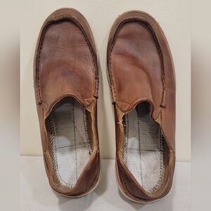Men's OluKai Kalia slip on leather moccasins loafers (sz 9.5). The insoles have been removed. The heel of the moccasins folds down to create a slip on shoe. Great for driving. Please see all pictures.