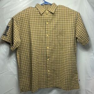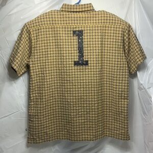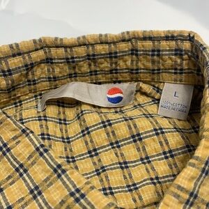 Men’s Pepsi Yellow & Blue Plaid Button Down Short Sleeve Shirt Size L. Has a 1 on both sleeves and on back of shirt.