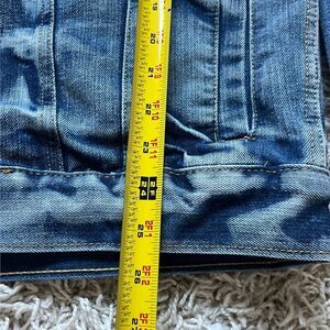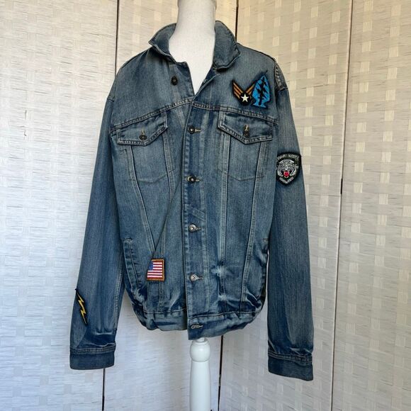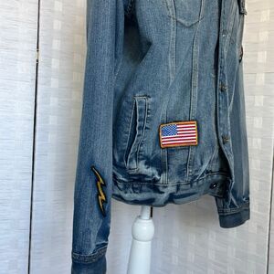 MENS RING OF FIRE PATCHED DISTRESSED DENIM JEAN JACKET SIZE L