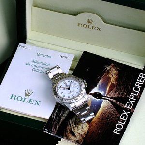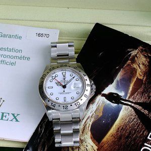 Details Brand: Rolex Model: Explorer II Reference Number: 16570 Movement: Automatic Case Case Material: Original Rolex Stainless Steel Case Diameter: 40mm Bezel: Original Rolex Bezel material: Stainless Steel Dial: Original Rolex Dial Color: White Hour Marker: Luminous Hour Marker Band Attachment Type: Original Rolex Oyster Bracelet Attachment Material: Stainless Steel Buckle Style: Double Deployant Buckle Material: Stainless Steel Measurements: Fits a wrist size of 7.5" Box: Original Rolex Papers: Original Rolex Certificate and Booklets Guarantee Our watches come with a 2 years warranty, and includes a certificate of authenticity as well as an appraisal certificate. Our warranty does not cover wear and tear, loss, theft, tampering, mistreatment or modification through the addition of subtraction of parts or accessories not supplied by Timekeepers Vault. All of our watches have been serviced by our in-house certified watchmaker, and each watch passes rigorous exams including water pressure test and time-keeping accuracy. This watch currently meets expected time-keeping standards.