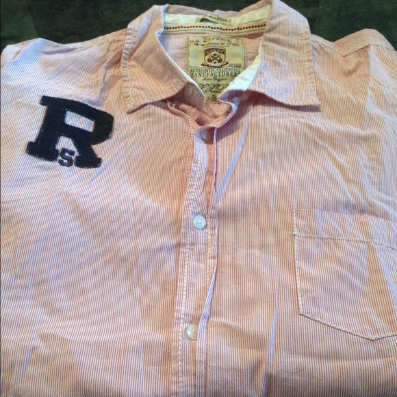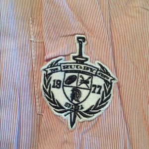 Authentic mens Rugby button up. Shirt is pink and white striped with blue and white accents. Very well taken care of ! No stains or stray marks