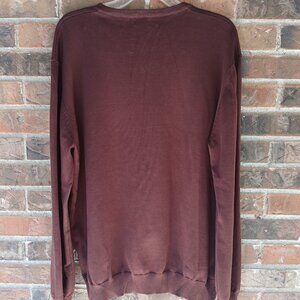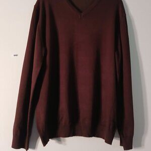This sweater is in like-new condition. It is brown, though sometimes has a burgundy/maroon look to it, depending on the lighting. Also, while a couple of the pictures seem to show that it's "stained" or "faded" at the bottom, it is NOT; it is one solid beautiful color!