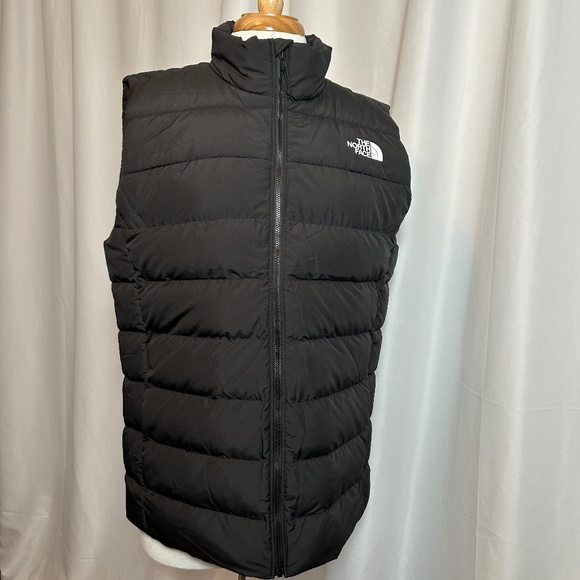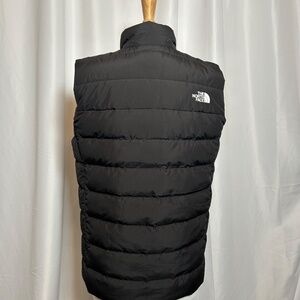 Stay warm and stylish in this The North Face Aconcagua 3 Men's Vest in size M. Made with polyester outer shell material and insulated with down, this black vest is perfect for casual outdoor activities in winter and fall. The full zip design, stand-up collar, and quilted style make it a functional and fashionable choice for hiking or other outdoor adventures. Machine washable for easy care, this vest combines quality and comfort for the modern outdoor enthusiast. Measures approximately 22" arm pit to arm pit. Comes from a smoke-free home.