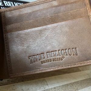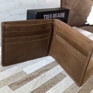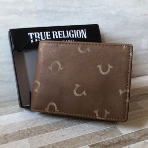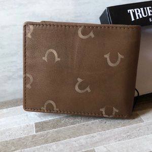 NWT MENS TRUE RELIGION HORSESHOE TAN BROWN LEATHER BIFOLD WALLET W/ORIGINAL GIFT BOX,VERY LIGHT weight.