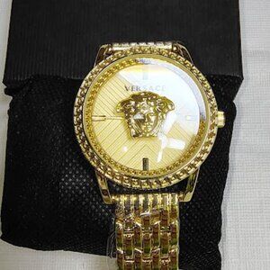 The Men's Versace gold on gold watch is a stylish and sophisticated wristwatch designed for men. With the iconic Versace brand name, this watch exudes luxury and elegance. The sleek design and reliable functionality make it a perfect accessory for any man looking to make a statement with their timepiece. Whether for everyday wear or special occasions, this Versace watch is sure to impress with its timeless appeal and high-quality craftsmanship.